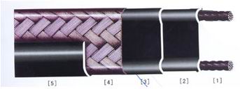 两根平行的铜绞线为电源母线,中间均匀挤满导电高分子材料为发热芯料。当母线接通电源时,电流横向流过两母线之间的发热芯料,使芯料升温,其电阻随之自动增加。当芯料温度升到一定值时,电阻已大到几乎阻断电流的程度,芯料温度不再上升。与此同时,芯料通过护套向被加热体系传热,温度下降,当温度下降到一定值时,电阻已逐渐减小,芯料发热温度再次上升。如此循环往复,便可维持被伴热体恒定温度。