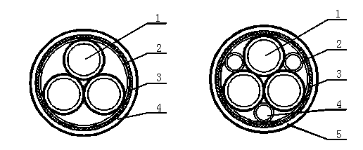 1-相线 2-包带 3-屏蔽层 4-外护套 1-相线 2-包带 3-屏蔽层 4-中性线 5-外护套