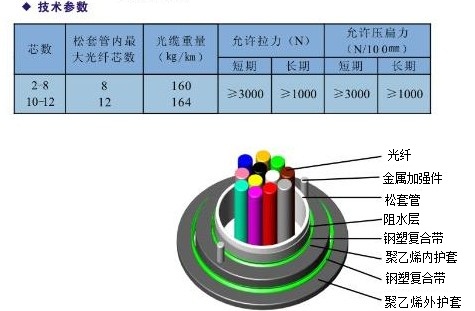 纵包双面覆膜皱纹钢带铠装。有效提高光缆抗侧压能力