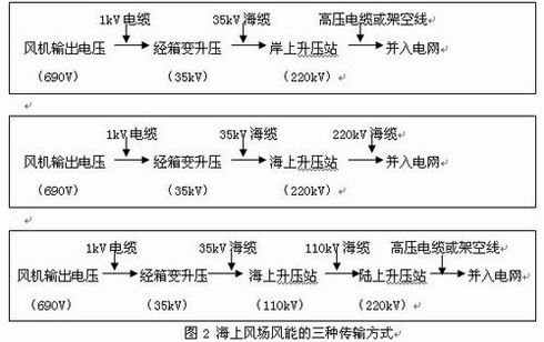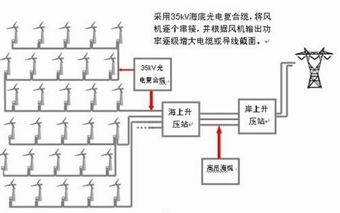 一般来说,应根据海上风场容量、接入电网的电压等级和综合经济性规划海上风电场风能传输方式,既可采用二级升压方式 也可采用三级升压方式。如果风电场较小(100MW以内)且离岸较近(不超过15km),可选用35kV海底光电复合缆直接把电能传送到岸上升压站。若海 上风电场容量较大且离陆地较远,考虑到35kV电缆传输容量、电压降、功率因数等问题,大多采用设立海上升压站的方式,岸上升压站可根据实际情况确定是否 设立。