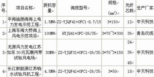 表2给出了我国最早的四个海上(含潮间带)风电场选用海底光电复合缆的情况,其结构形式与技术要求基本相同,其中龙源风力发电潮间带试验风电场 根据潮间带施工特点、地形地貌等环境条件和海缆设计资料,选择了细钢丝铠装作为电缆的外铠保护层。