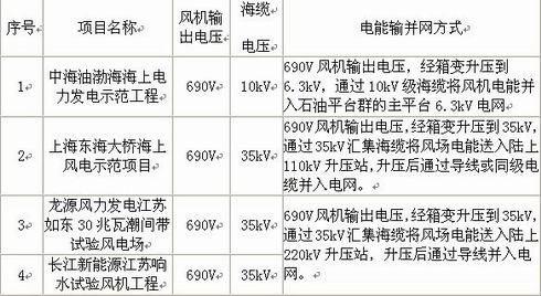 表1是我国已运行的几个试验风电场(风机)的电能输送方式: