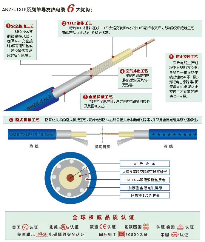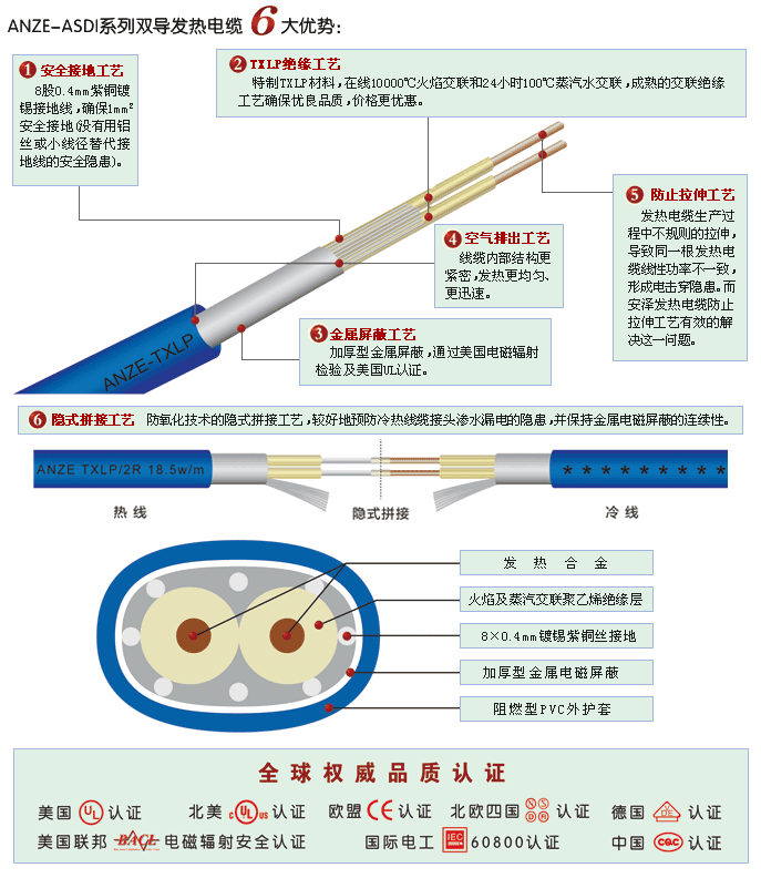 注:电工发热电缆设计电压为:220V,标准长度为发热区尺寸,导线尺寸为2.25M,印字参见示例3300W。示例:ANZE LS TXLP/1 Nom 14.7 ohm 3300 w - 17w/m @ 220VAC 10/2003 AZV02173300 CE