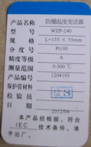 带温度变送器隔爆热电阻利用间隙隔爆原理,当腔内发生爆炸时,能通过接合面间隙熄火和冷却,使爆炸后的火焰和温度传不到腔外,从而进行测温。热电偶(阻)产生的热电势(电阻值)经过温度变送器的电桥产生不平衡信号,经放大后转换成为4-20mA的直流电信号给工人仪表,工作仪表显示出所对应的温度值。