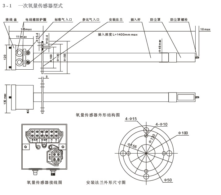 ZO系列氧化锆氧量分析仪又称氧化锆氧分析仪、氧化锆分析仪、氧化锆氧量计、氧化锆氧量表,是我公司最早开发的智能化氧含量分析仪具有灵敏度高、再现性和稳定性好、量程宽、可自动切换、响应快和可连续在线测量等特点, 能与各种电动单元仪表,常规显示记录仪及DCS集散控制系统配合使用。它是由氧化锆探头和氧量变送器二部分组成,广泛应用于冶金、电子、石化、化纤、玻璃、建材、磁性材料和制氧等行业,是工艺过程控制、产品检测的理想设备。可对锅炉、窑炉加热炉等燃烧设备在燃烧过程中所产生的烟气含氧量进行快速、正确的在线显示、检测、分析,以实现低氧燃烧控制,达到节能,减少环境污染。 氧化锆氧量分析仪由氧浓度差电动势,经检测仪表转换成与被测气体含氧量成线性关系的标准电压信号,输入到数字仪表输入端,经A/D转换输入到仪表的CPU,经运算后,一路输送至仪表显示氧含量, 一路输送至仪表显示温度值,并输出相应的脉冲控制信号控制温度值,或4-20mA模拟信号,供其他控制系统使用,仪表设有氧含量、温度报警指示,并附有外接报警继电器。仪表采用可靠的开关电源,冷端补偿采用三线制Pt100,低漂移运放,高分辩率A/D转换,LED高亮度、双排数字显示,PID温度自整定控制,带有4-20mA。 ZO系列氧化锆氧量分析仪有一次氧量传感器法兰插入式安装,二次显示仪表盘装嵌入式或墙挂式两种安装方式。氧量传感器与二次仪表或变送器间的接线有氧化锆、热电偶、加热炉共计六根屏蔽电缆线(分别接氧电势、热电偶信号、加热炉信号)来传输信号。ZO型系列氧化锆氧气含量分析仪一次氧量传感器采用耐高温的不绣钢管,耐腐蚀陶瓷,安装法兰,接线盒,防尘罩等材料制成(适用于烟气温度≤800℃,二氧化硫SO2气体浓度较小的工况场合)。 二、技术参数: 一次氧量传感器| 外 型 | 外型尺寸mm | 开孔尺寸mm(高×宽) |